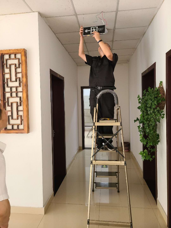 圖為技術(shù)人員安裝現(xiàn)場(chǎng) 在得知這一情況后,維養(yǎng)中心積極協(xié)助收費(fèi)站所購(gòu)買(mǎi)相關(guān)的主材及配件,并主動(dòng)承擔(dān)了這些設(shè)備安裝工作。由于設(shè)備安裝位置很多沒(méi)有直接可用電源,中心技術(shù)員們就從四五米外甚至更遠(yuǎn)的地方,一路套管放線(xiàn)過(guò)來(lái)取電,并用電錘等工具為其開(kāi)孔固定,最后再完成接線(xiàn)送電。經(jīng)過(guò)2天努力,這些帶有方向提示標(biāo)識(shí)、安全出口標(biāo)識(shí)的燈牌被安裝在各層樓梯出口、拐角或主要通道上,因全部帶有儲(chǔ)電功能,即便在斷電的情況下也能發(fā)光發(fā)亮。