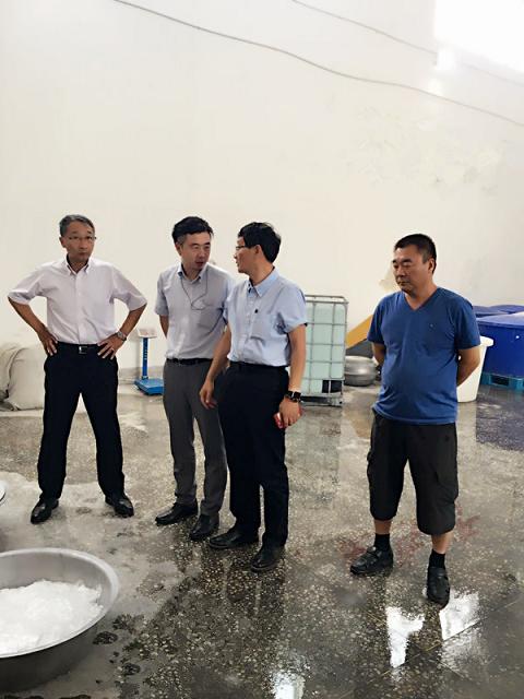 小原購(gòu)買(mǎi)部主事絃楽峰さん(左)、盛と技師劉明鋼さん(左二)、小原會(huì)社事業(yè)部長(zhǎng)開(kāi)沼さん(中)、盛と會(huì)長(zhǎng)靑に縄さん(右2)、盛社長(zhǎng)と羅建民さん(右)寫(xiě)真