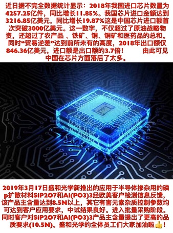 BeAl2O4。2019年正式進(jìn)入國際市場。2019年3月21日經(jīng)歐美客戶檢測;Cr+3:BeAl2O4、KBe2BO3F2、Nd+3La2Be2O5、晶體透明且均勻,無明顯應(yīng)力,確定是單晶體,材料透明干凈無雜晶,完全達(dá)到他們的激光器件上使用要求!決定先采購50支。3。近日據(jù)不完全數(shù)據(jù)統(tǒng)計(jì)顯示:2018年我國進(jìn)口芯片數(shù)量為4257.25億件,同比增長11.85%。我國芯片進(jìn)口金額達(dá)到3216.85億美元,同比增長19.87%這是中國芯片進(jìn)口額***突破3000億美元。這一數(shù)字,不僅超過了原油這一戰(zhàn)略物資,還超過了農(nóng)產(chǎn)品 、鐵礦、銅、銅礦和醫(yī)藥品的總和。同時(shí)“貿(mào)易逆差”達(dá)到***的高度,2018年出口額僅846.36億美元,進(jìn)口額是出口額的3.7倍!由此可見,中國在芯片方面落后了太多。2019年3月17日盛和光學(xué)應(yīng)用于半導(dǎo)體摻雜的磷P擴(kuò)散材料SiP2O7和Al(PO3)3,經(jīng)歐美客戶檢測信息反饋。產(chǎn)品質(zhì)量主含量達(dá)到8.5N以上,其它有害雜質(zhì)元素均達(dá)到客戶使用要求。決定批量釆購。同時(shí)對兩個(gè)產(chǎn)品的主含量提出更高更新的要求,主含量要求10.5N~11N!盛和光學(xué)的全體員工們第二季度大家共同加油啦!4。2019年***季度即將結(jié)束!LMG認(rèn)為全球經(jīng)濟(jì)一體化就和進(jìn)入賭場一樣。進(jìn)入----存在著不確定性,應(yīng)該大力度投資。開始賭博----存在著輸贏的正確判斷性,有25%~45%的輸贏率,正確判斷是否繼續(xù)。出來時(shí)----存在著兩面性,繼續(xù)加大投資還是調(diào)整后再說!。